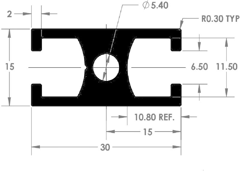With its cross-sectional size of 15mm x 30mm, the profile provides a compact yet sturdy structure that is ideal for small to medium-duty assemblies. It features a slot width of 6mm (±0.2 mm), allowing easy compatibility with standard slot-6 accessories such as T-nuts, bolts, and angle brackets. The center hole diameter of Ø5.5 mm is suitable for M5 threading or self-tapping, enabling quick and secure fastening without additional machining.