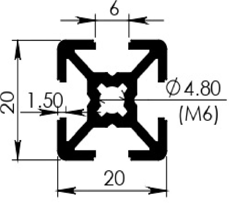 The moment of inertia for this profile is Ix = 0.7 cm and Iy = 0.7 cm, demonstrating uniform strength and stiffness across both axes. The slot width of 6.15 mm (±0.2 mm) is perfectly compatible with standard M6 T-nuts, bolts, and accessories, offering flexibility for joining, mounting, and expanding assemblies. Its center hole diameter of Ø4.8 mm allows for M6 threading or self-tapping screws, providing a versatile interface for mechanical connections.