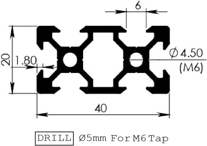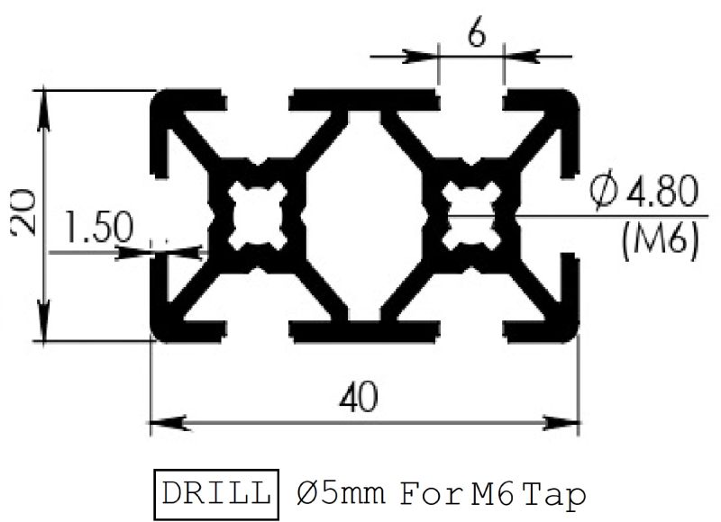Its 20mm x 40mm V-shaped structure allows precision linear motion using V-wheels or carriage systems. The profile weighs 0.75 kg/m (±150g) and provides excellent rigidity with a moment of inertia of Ix = 4.6 cm and Iy = 1.2 cm. The slot width (6.15 mm) fits M6 fasteners, while the center hole Ø4.8 mm supports threaded or self-tapping connections.