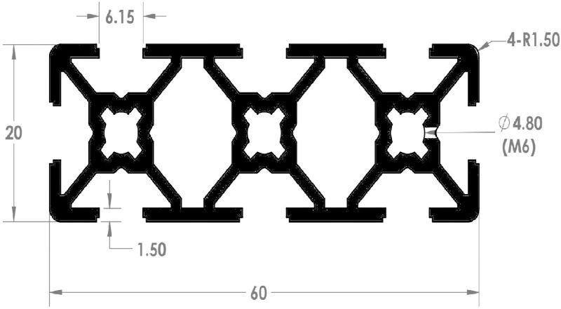 The profile’s slot width of 6.15 mm (±0.2 mm) is designed for M6 bolts and slot-6 T-nuts, ensuring compatibility with a wide range of connectors and accessories. The center hole diameter of Ø4.8 mm allows for M6 threading or self-tapping, enabling secure connections and versatile assembly options.