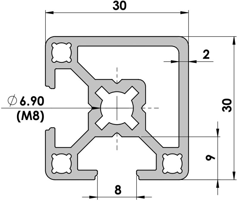 With dimensions of 30 × 60 mm and a weight of 1.40 kg/m (±150 g), this profile delivers excellent rigidity with a moment of inertia of Ix = 18.8 cm Iy = 6.0 cm. The slot width 8.2 mm (±0.2) accommodates M8 bolts and T-nuts, and the Ø6.9 mm center hole supports M8 threading.