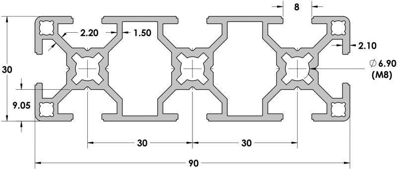 With a cross-section of 30mm × 90mm, this profile offers an ideal combination of durability and modular flexibility. Weighing 1.99 kg/m (±150 g) and featuring a profile surface area of 739 mm², it provides excellent load-bearing capability for its weight class. The moment of inertia (Ix = 58.2 cm Iy = 7.5 cm) ensures outstanding bending resistance, while maintaining easy machinability for fabrication.