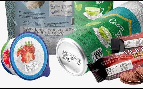 Date codes, batch numbers, and expiry dates on food and beverage packaging.