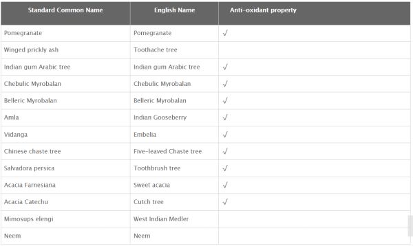 - Indian Gum Arabic Tree's fresh twigs are used to protect gums and teeth. The bark extract has tannins which are known for their antioxidant properties.