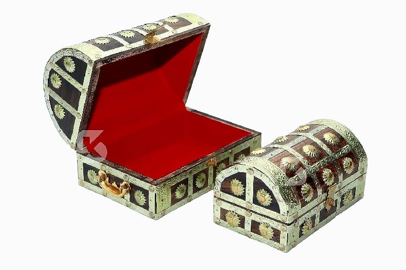 Wooden Retro Brass Work Jewellery Box Sandook Treasure Chest, multi storage unit, Set of 2 Size: 9x6x4 big6x4x3 small