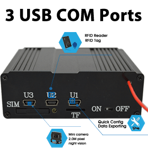 Support 3 USB COM ports for multiple sensors and components : More 2 USB COM ports than common GPS tracker makes OCT900 be able to work for more applications. It is able to connect different sensors or components. Include: temperature sensor, RFID controller, Bluetooth, wifi, etc. This will be a grate help for fleet companies which need nixed features for their business