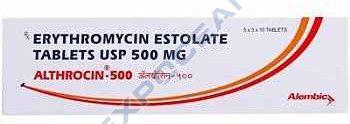 We offer Althrocin Erythromycin Tablets, a potent antibiotic medication containing Erythromycin as the active ingredient. Manufactured by Alembic, these tablets come in a convenient box packaging. Althrocin tablets are in the form of easy-to-administer tablets, suitable for various bacterial infections. Store at room temperature away from moisture and heat for optimal efficacy. As an exporter, supplier, and trader, we ensure high-quality products for your healthcare needs.