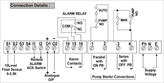 | Outputs | Pump Relay - 2NO Rated 5A@ 250V AC Resistive Load. Alarm Relay - 1C/O Rated 10A@ 250V Resistive Load. Analogue O/P - 0 - 10V Dc / 15mA. |