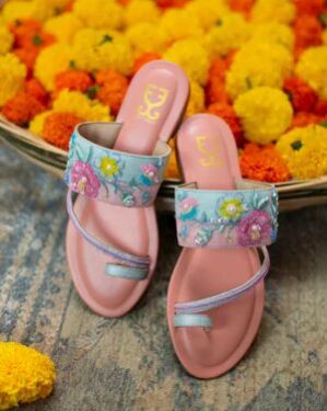 With gorgeous patterns and pearls on a sky-blue base, this pair includes dreamy fairytale vibes. The pair is comfortable and perfect with your casual kurtas, denims, and other everyday wear.