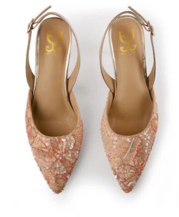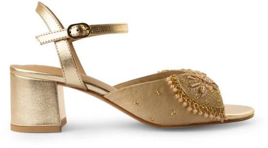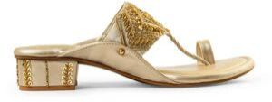 If you want a fun festive style that steals all the attention then opt for this stunning pair thats highlighted by gold and brass sequin embroidery. With comfy cushioning, this heel can be teamed up with your saree and other flowy traditional wear.