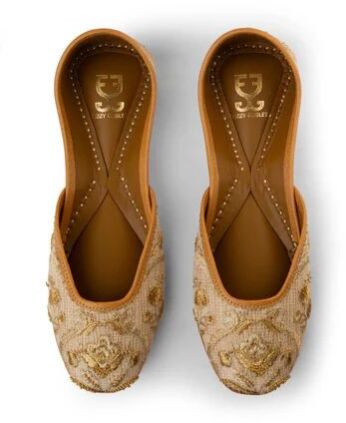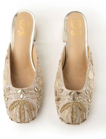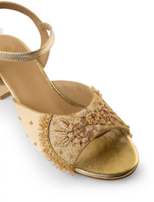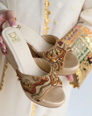 With a blend of timeless elegance and intricate craftsmanship, this heel is adorned with exquisite embellishments, making them perfect for festive events, weddings, and other formal gatherings. Its neutral gold palette and zari dabka work enhances the sophisticated touch. You can pair it with traditional lehenga, saree, or even a contemporary fusion outfit
