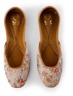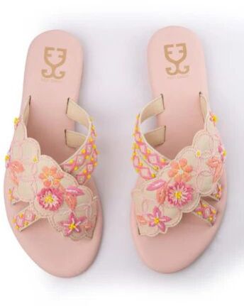 Heres a statement pair for your special occasions! Yes, this pair can easily level up your style game and make you look distinctive. Highlighted by hand-embroidered floral motifs on a nude-pink base, these juttis absolutely deserve a place in your closet.