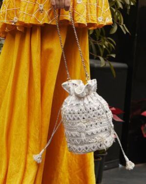 Highlighted by mirror-work and 3D pearl flowers on a raw silk base, this potli is handcrafted to make you look distinctive. You can style this ivory-hued potli with any traditional outfit