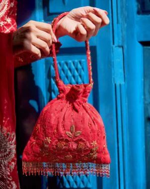 Heres a potli so vibrant that you'd want to carry it to every special occasion. Adorned with beads, crystals, and sequins, this arch-shaped potli is definitely a unique addition to your closet. Pick it up for festivities and weddings
