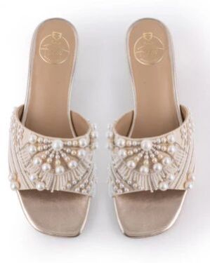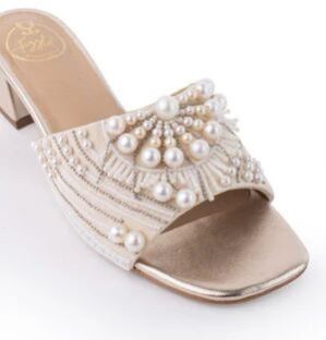 Handcrafted with an artfully arranged lustrous string of pearls, this elegant pair is a perfect pick for garden parties and special date nights. The multi-coloured florals in glass beads and zari threadwork on a satin base adds a touch of charm. This heel can go well with your traditional pastel outfits and evening gowns too.