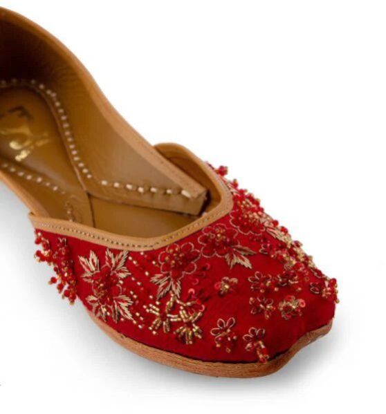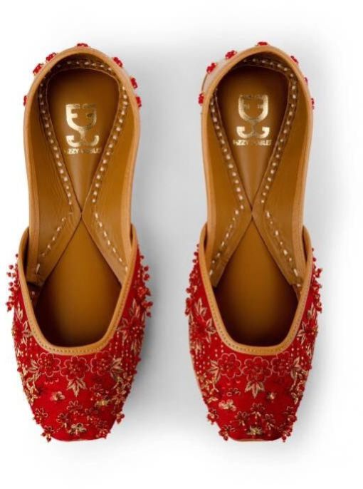 Heres your inspiration to look regal for the festivities and other grand occasions. Adorned with exquisite crystal and beads on a deep red silk base, this jutti is handcrafted to mesmerise. Its a perfect match with your red or maroon outfits and can look equally impressive with gold or black-toned ethnic wear