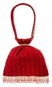Accentuated by zardozi work in resham threads, red crystals, and gold beads, this potli is a stunning scene-stealer. The work on this silk potli is exquisite and the gold and red tassels finishing enhances the look. A perfect pick for wedding and festive occasions