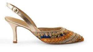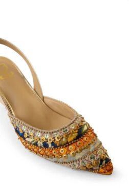 Accentuated by the opulent brocade work with an interplay of striking beads, this heel captures the essence of ancient city and old-world charm but with a modern spin. Its intricate craftsmanship and lines of vibrant tones makes it a perfect addition to your celebratory closet. You can style it with your lehenga and sarees to add a unique flair to your look.
