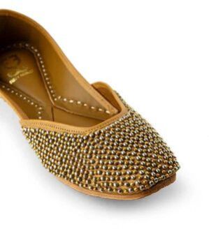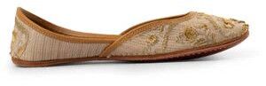Look classy with a pair of jutti thats highlighted by intricately-done mirror work. This pair also features gold and silver zari and beads, which adds to the glamorous touch. A closet must-have, you can pair it with your stunning ethnic wear and make a statement