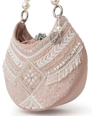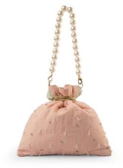 Accentuated by pink floral notes on a raw silk base, this potli can help you exude regal vibes. It is punctuated by a sprinkle of pearls and detailed resham thread work, which accentuates this potli and makes it a statement piece. The pearl handle adds to the finishing touch. You can style it on grand occasions with your stunning traditional wear