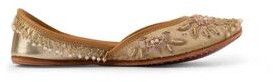 Add a regal touch to your look with this intricately-done golden jutti. Highlighted by ornamental hand-embroidered motifs with shades of gold zari on a textured woven fabric, this jutti makes for a timeless treasure