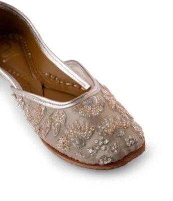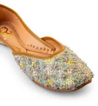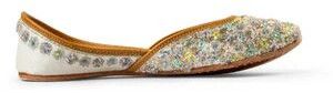 Adorned with delicate glass beads, sequins, and zari on a silver tissue mesh base, this dreamy jutti is what your closet deserves. It is exquisitely handcrafted to complement your number of traditional outfits. So, dont think twice, get this pair already