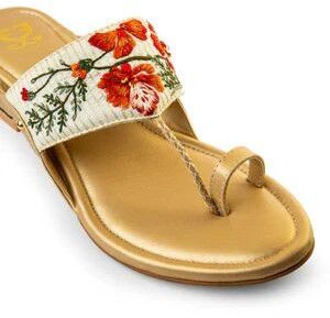 This floral pair is a delightful celebration of natures beauty, designed to infuse a sense of joy to your look. This kolha showcases a vibrant array of blossoms using resham threadwork. The comfy sole provides all-day comfort.