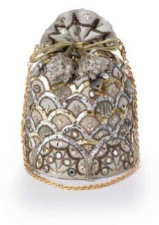 Highlighted by geometric embroideredtessellation, this gold-toned potli can easily add a glamorous touch to your style. It is adorned with laser-cut mirrors and beads, and features a personalised note, making it a treasured pick for all your celebrations.