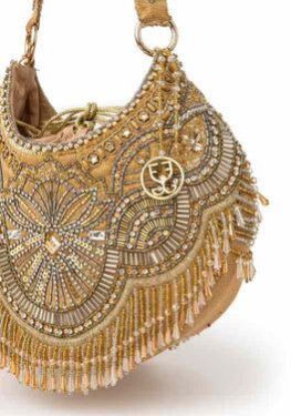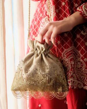 Want to look effortlessly glamorous? Style this potli thats adorned with ditzy motifs, gold tones, beads, and cutdana work. This stunning accessory is perfect for festive and wedding occasions