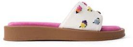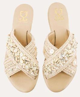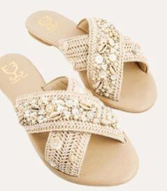 Its a dessert kind of a day and we are serving a perfect pair to you. Adorned with floral patterns and scalloped edging, you can team up this raffia criss-cross slide with your pink and other pastel outfits