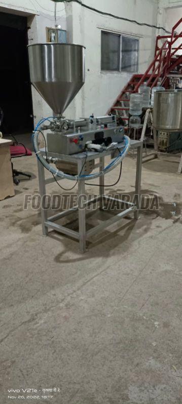 This semi-automatic piston-type Paste Filling machine is suitable for filling thick viscous liquids with granules or pieces.