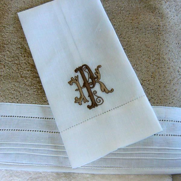 Luxury linen guest towel , 50/100 cm , with art embroidery pattern or baroque-2 letters-monogram, white colot ( other colors are available)