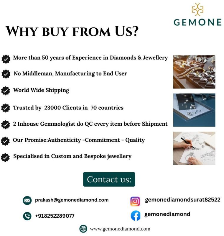 Gemone offers a wide range of premium lab-grown diamonds, including loose diamonds and exquisitely crafted fine diamond jewellery. With over 30 years of experience in the diamond industry, we take pride in delivering quality, trust, and craftsmanship. Whether you're looking for a classic design or something truly unique, we specialize in creating custom jewellery tailored to your exact preferences. Just share your ideas or designs, and we'll bring them to life with precision and care. Product Details: