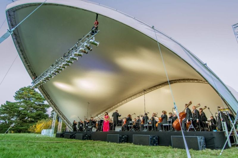 An auditorium tensile structure isa type of architectural design that uses a flexible, lightweight membrane, like fabric, supported by a framework of cables or masts, to create a roof or canopy for an auditorium.This structure is characterized by its ability to cover large spans without the need for internal columns or beams, providing a spacious