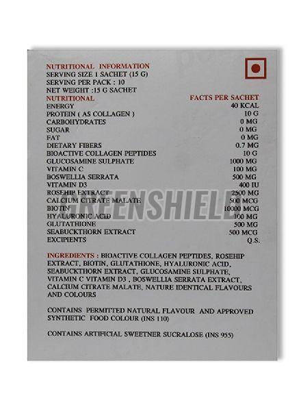 Bioactive Collagen Peptides, Rosehip Extract, Biotin, Glutathione, Hyaluronic Acid, Seabuckthorn Extract, Glucosamine Sulphate, Vitamin C Vitamin D3, Boswellia Serrata Extract, Calcium Citrate Malate, Nature Identical Flavours And Colours
