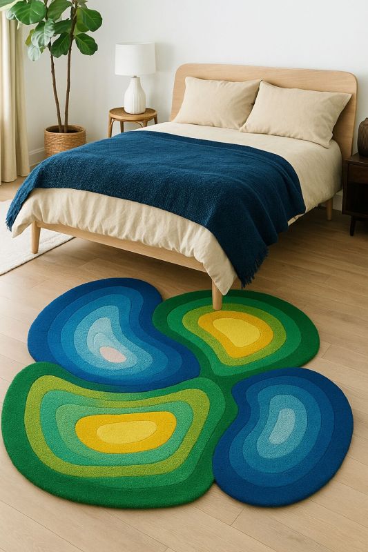 Elevate your space with the organic beauty of the Topography Dream rug, a handmade high-grade tufted masterpiece. Inspired by natural landforms and contour maps, this irregulal rug features fluid, layered gradients of greens, blues, and golden yellows. Itssoft yet durable tufted texture offers both comfort and artistry, making it a striking centerpiece for modern interiors. Perfect for living rooms, studios, or creative spaces, this rug is not just decor - its a staement piece that blends natures pattern with contemporary desugn. Each rug uniquely crafted, ensuring no two are ever exactly the same.