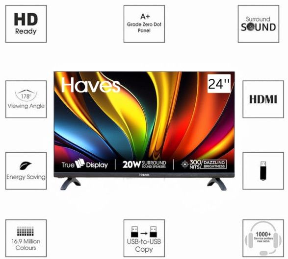 In The Box:1 TV Unit, Remote, User Manual, Base Stand, Stand Screws, Wall Mount Kit, AAA Batteries, Resolution:HD Ready (1366 x 768p), Refresh Rate:60Hz, Connectivity: 2HDMI Ports for set-top box, Blu-ray players, and gaming console; 2 USB Ports for pen drives & hard disk drives, 1 VGA Port to connect to your laptop or computer as a monitor;Sound:20 Watts Output (10 x 2), Virtual Surround Sound
