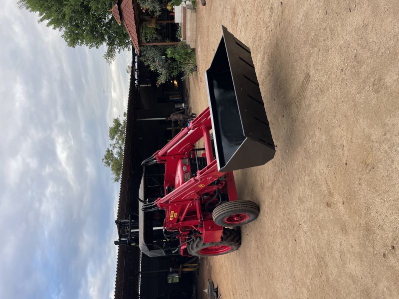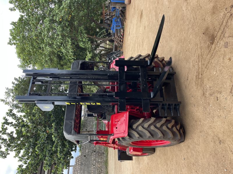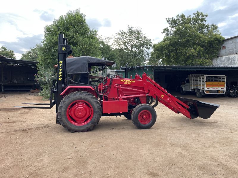 This machine is equipped with a gravel loader at the front and a forklift attachment at the rear, making it a versatile solution for construction and industrial needs.