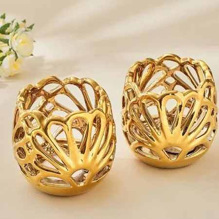 Elevate your decor with this modern Metal Flower Shape T Light Candle Holder Set. Crafted from golden metal, this set of 4 standard-sized candle holders features a stylish flower shape design. Perfect for adding a touch of elegance to any room, these decorative pieces will create a warm and inviting ambiance in your home.