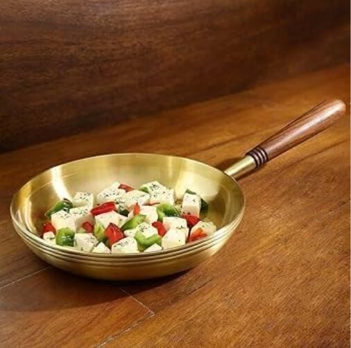 "A classic brass frying pan, perfect for achieving an even sear and a beautiful golden-brown finish on your favorite dishes. Its excellent heat conductivity ensures consistent cooking results."