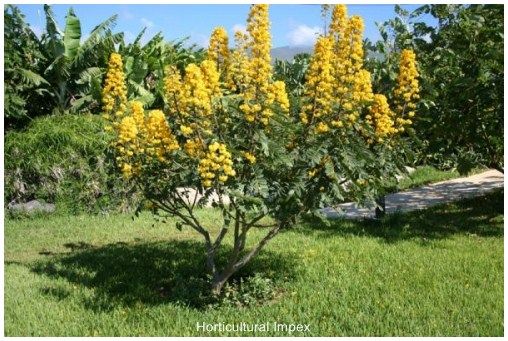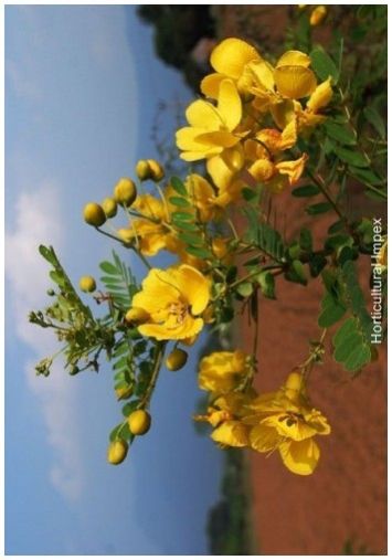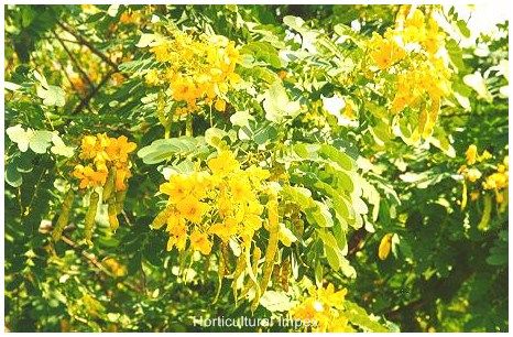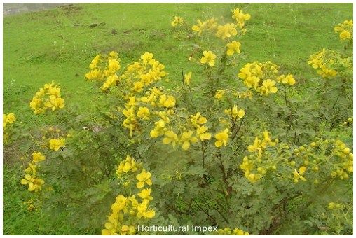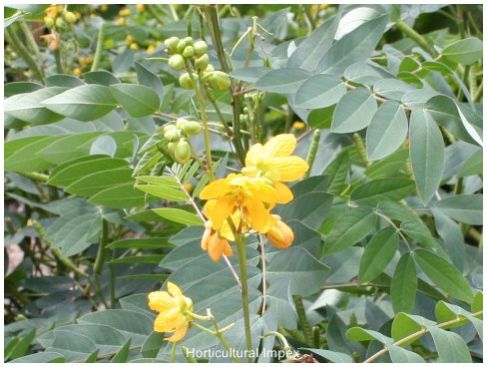 Cassia auriculata a shrub with large bright yellow flowers, growing wild in Central Provinces and western peninsula, and cultivated in other parts of India. The plant attains a height of 7mt. Its flowers are bright yellow in colour and zygomorphic. Bark is thin, brown, lenticellete. Leaves alternate, peripinnately compound, stipules large and leafy. The seed, flower and bark contain pyrrolizidine alkaloids. In India, the flowering season are mainly two, first is in early monsoon and second is late monsoon. It is valuable as a tanning material, as a plant for reclothing barren tracts, and as a green manure crop. The plant can be cultivated in many parts of India. It prefers a light porous soil. It is immune from browsing by cattle and goats, and as the plant is not exacting in its requirements, plantations are easy and cheap to raise. The cheapest method of cultivation is by sowing in furrows 2 -5in. apart and 4 - 6in. deep. It is native of India, Myanmar, Shri-Lanka and also grown successfully in African countries.