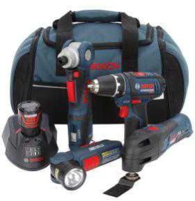 we are offering bosch 12-volt lithium-ion combo kit (4-tool). the bosch 12v lithium-ion line of cordless tools and combo kits use the industry's most advanced lithium-ion technology for greater battery life and more run time, all in a lighter package. the bosch 12v max lithium ion combo kit comes with the ps50-2a multi-x oscillating tool, ps10-2a i-driver, the ps30-2a 3-jaw chuck driver, and the fl10 flashlight. the bosch difference - the most durable cordless tools in their class, 3-year provantage tool protection plan - the best tool service program available, 2-year battery life guarantee. ps10 features 90 degree articulating head, rotates and locks into five positions for increased versatility, ultra-compact head length 3.5 in. total head length - 3 times shorter than most popular competitor. ps10 i-driver ps30 dd multi-x flashlight with 2 batteries and charger ps30 features 38 single sleeve chuck - for quick accessory changes uses standard drill bits, led light - increased visibility in low light applications, 20 position clutch ps50 oscillating tool is versatile flexible in applications and material - has corded performance for cutting, sanding and other applications; suitable for soft wood, hard wood, dry wall, plastic, or metal this new bosch fl11a, allows for the user to fit into tight spaces with this compact flashlight. this flashlight is powered by the bosch 12 volt lithium ion battery system includes: ps10b i-driver, ps30b drilldriver, ps50b oscillating tool, (1) - fl10 flashlight, (1) - jobsite bag, (1) - charger, (2) - 12 volt batteries, (1) - 1.5 in. power drill bit, (1) - hcs plunge cut blade - osc112, (1) - oscad1 adapter, (1) - allen key. the bosch difference - the most durable cordless tools in their class, 3 year provantage tool protection plan - the best tool service program available, 2 year battery life guarantee