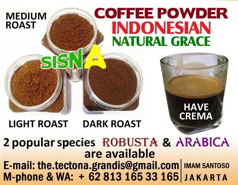 We are offering roasted coffee powder. Indonesian coffee has specific aroma types of coffee starting from robusta (100%), arabica (100%) and javano (blended), all are from indonesia particularly java island the well known place since hundreds year ago where people in north american countries call coffee as java. Degrees of roasting are light, medium and dark for further information