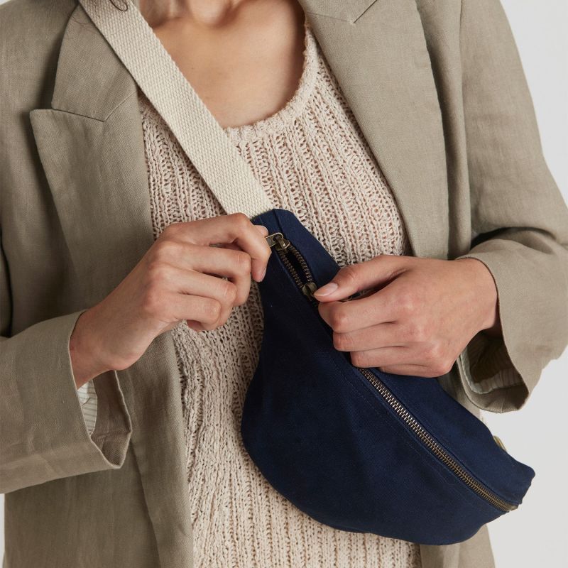 Material: Pure cotton canvas body with printed cotton lining; expandable and detachable crossbody strap made of braided cotton yarn