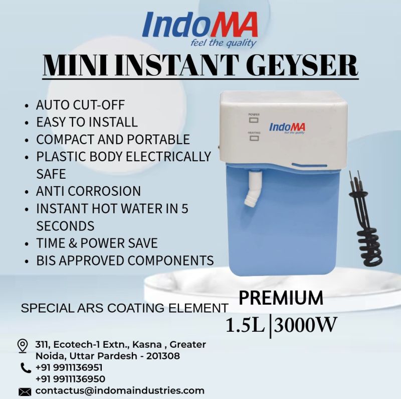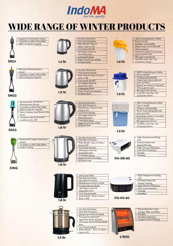 Our Complete range of products are Quartz Heaters, Water Heaters, Indoma Immersion Water Heater, Waterproof and AUTOCUT , 1500 W, Indoma Immersion Water Heater, Waterproof , 1500 W and Premium Electric Geyser.