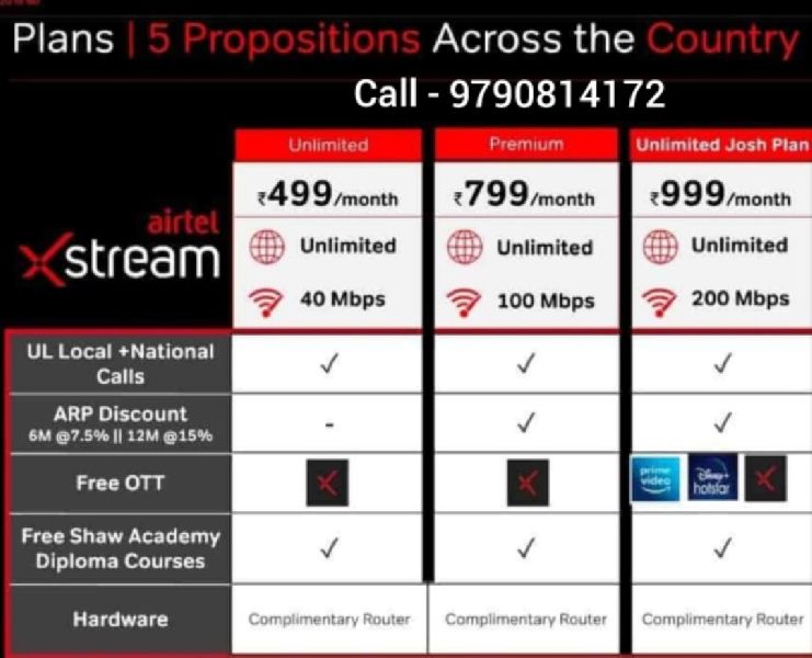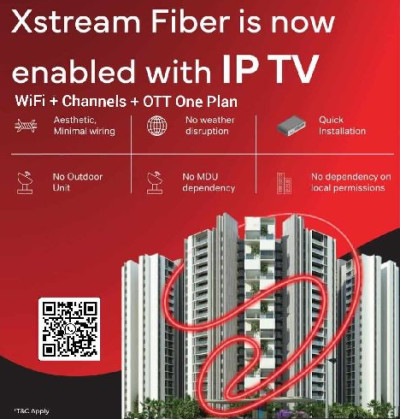 Airtel Fiber now offers IP TV. The plan, starting at Rs. 699*, includes WiFi, TV channels, and OTT. For more information, call 9790814172.