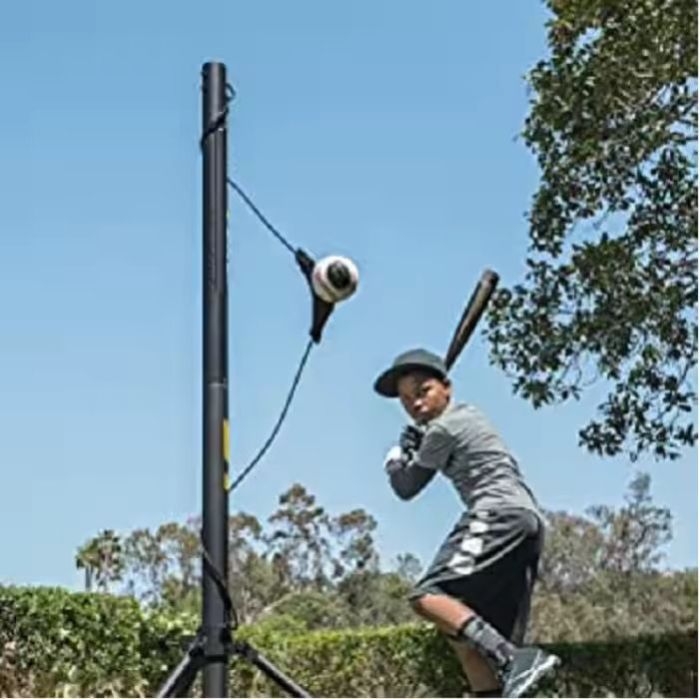 The Hit-A-Way Select features a 2-piece durable center pole with removable legs for easy breakdown, storage, and transportation. It also comes with a carry bag and 3 large metal spikes for anchoring. Recommended for ages 13 and under, this swing training device targets several aspects of an athlete's swing performance. The Hit-A-Way Select is a dynamic swing trainer that helps improve batters timing, contact, and confidence at the plate, and is perfect for team or solo practice. By utilizing the twist-back ball and cable design, athletes can simulate real pitches during practice or at-home training. The unique customizable design allows for athletes to easily adjust the cable and ball position for different pitch locations. The trainer can be used by both right or left-handed batters to improve swing timing and stride length to help create a smoother swing. For maximum repetition, athletes keep the ball in motion by hitting the ball as it returns around the center pole. Built to withstand hours of practice, its tough enough to hold up against seasons of use. This product was the first of its kind and has been engineered for long-term swing improvement.