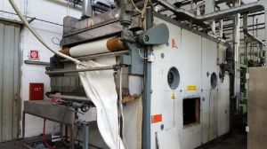 ARIOLI Steamer, Type: MiniVapo, year 1995. Fabric capacity inside machine up to 65 mt, rolls width 2200mm, working width 1900mm. Speed from 3, 2 to 32 mt/min. The machine is composed of the following: steaming chamber AISI 430 stainless steel, -fabric entrance and exit cylinders driven by c.c. motors, -fold forming device, fabric transportation on glass fiber sticks, steam conditioning devices, -steam or air recirculation fans driven by two-speeds motors, -humidification system with water injection into steaming chamber, -diathermic-oil heating for H.T. and for fixing in hot air. -Fabric entrance and folder driven by c.c.motor. -2 lateral doors opening the chamber, inspection window. -Electric board with control equipment. -2 exhausting fans driven by two-speeds motors. -Steam and water valves. -Exit small calender with pneumatic pistons. -2 nebulizing nozzles on front and back.