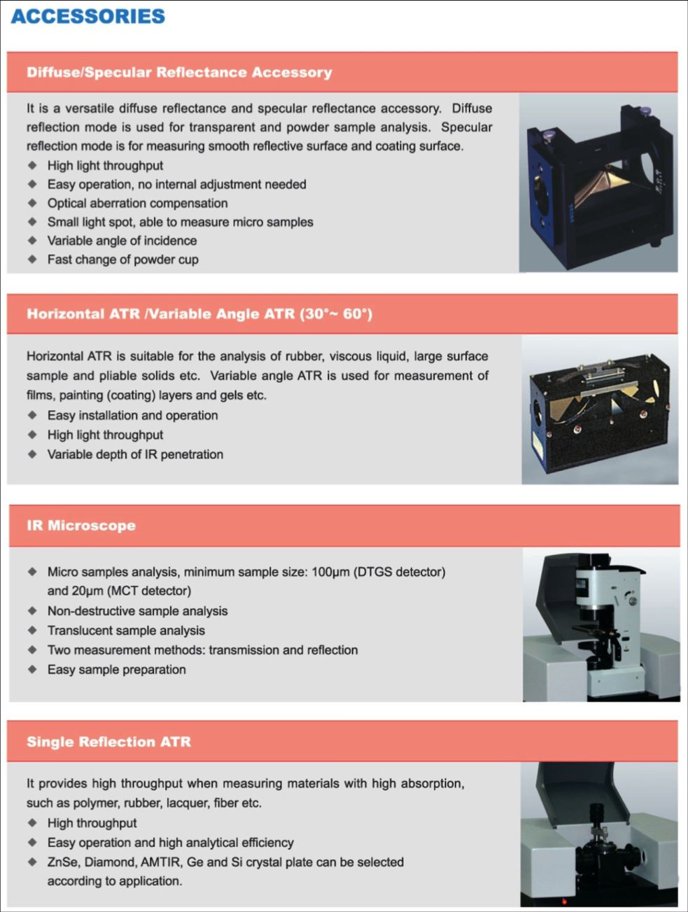 Accessories such as Defused/Specular Reflection, ATR, Liquid cell, Gas cell, and IR microscope etc can be mounted in the sample compartment.