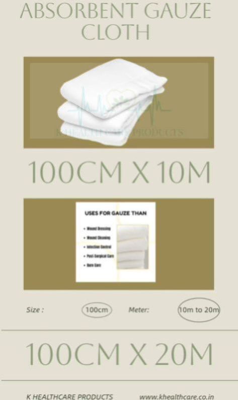 The Absorbent Gauze Cloth is from Khealthcare, and these are fine fabrics that can be used in many ways. Since we are a prominent Absorbent Gauze Cloth Manufacturer, we focus on manufacturing long-lasting and highly absorbent cloth. Handloom Gauze Cloth offered by us is made with precision to provide excellent performance in diverse uses.